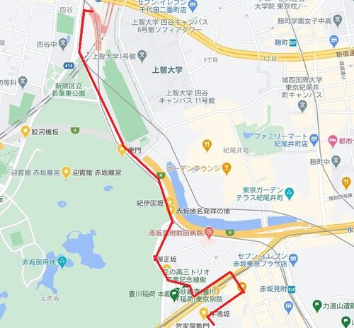 どんどん北上して青山通りへ出る。 通りを少し進んだ後は南東へ進む。 ◆末廣稲荷神社 ◆薬研坂 阪上。 こっちも坂上。 中央がくぼみ両側の高い形から薬を砕く薬研に似ているために名付けられた。付近住民の名で、何右衛門坂とも呼んだ。 ◆弾正坂 阪上。 坂の…