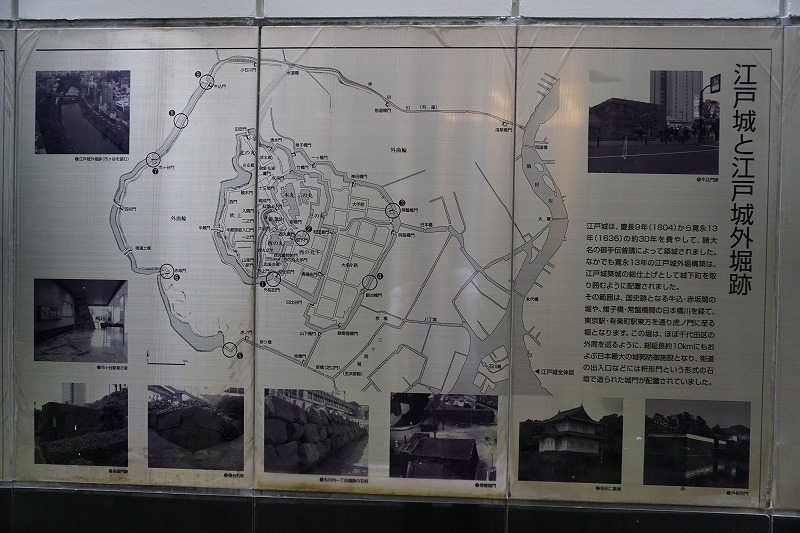 その範囲は、 国史跡となる牛込・赤坂間の堀や、 雉子橋・常盤橋間の日本橋川を経て、東京駅・有楽町駅東方を通り虎ノ門に至る堀となります。 この堀は、 ほぼ千代田区の外周を巡るように、 総延長約10kmにもおよぶ日本最大の城郭防御施設となり、街道の出入口などには枡形門という形式の石垣で造られた城門が配置されていました。