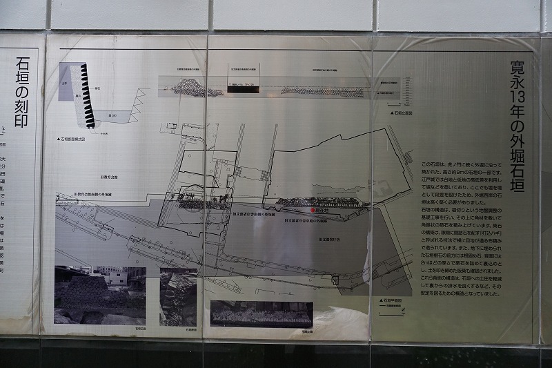 正面の石垣は、虎ノ門から続く江戸城外堀の一部です。 この石垣は、寛永13年 (1636) に築かれたものですが、 部分的に不揃いな積み方があることから、数度も改修されたと考えられます。 石垣表面には石を割った矢穴や構築大名を示す刻印がみられます。