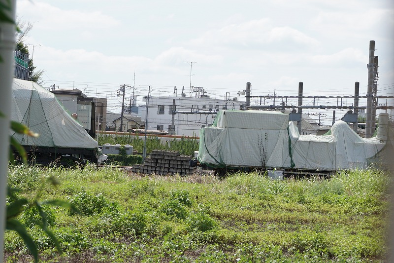 シートがかぶせられているが、蒸気機関車の形をしているのが分かる。