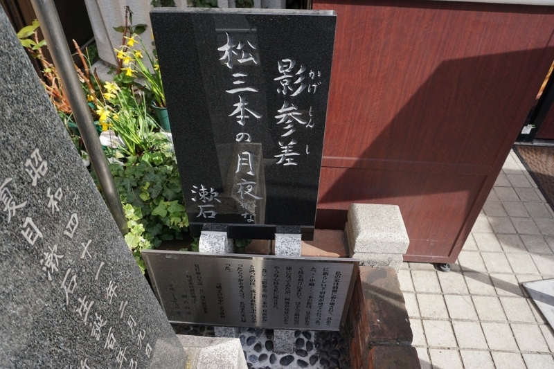 この記念碑は昭和四十一年(1966)に漱石生誕百年を記念して新宿区が建てたもので、題字は漱石の門下生安倍能成(あべよししげ)の筆。