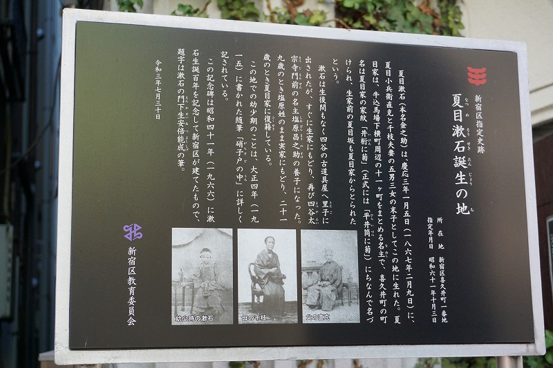 夏目漱石(本名金之助)は、慶応三年(1867)一月五日に、夏目小兵衛直克と千枝夫妻の五男三女の末っ子としてこの地に生れた。夏目家は、牛込馬場下横町周辺の十一ヶ町をまとめる名主で、喜久井町の名は夏目家の家紋「細井筒(ほそいつつ)に菊」に因んで名づけられ、夏目坂も夏目家に因んで命名されたという。