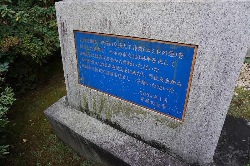 この鐘は、新羅の聖徳大王神鐘 (エミレの鐘)を縮小した複製で、本学の創立100周年を祝して1983年に韓国校友会から寄贈いただいた。
