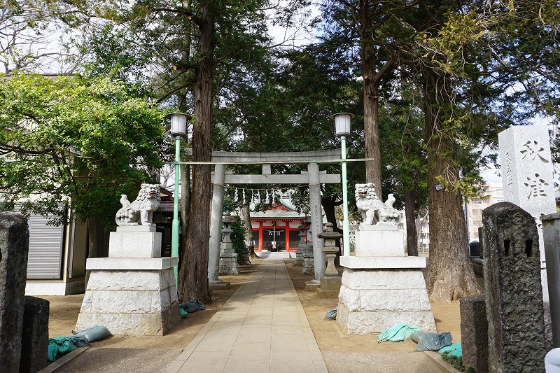 そして、この本殿内には石造舟型の不動尊像があり、背面下面の銘文からは、人間郡安松の長源寺の住僧宝応が元禄十二年(一六九九)四月に寄進したことが記されており、この頃には確かに南秋津に不動堂が位置していた。南秋津村下組の鎮守として「秋津のお不動様」と呼ばれ親しまれ多くの参詣者があり、緑日はとても賑わったとのことです。尚、当社の例大祭は七月二十八日ですが、この日は不動明王の縁日であり、かつて不動堂だった時の名残をそこに見ることができます。