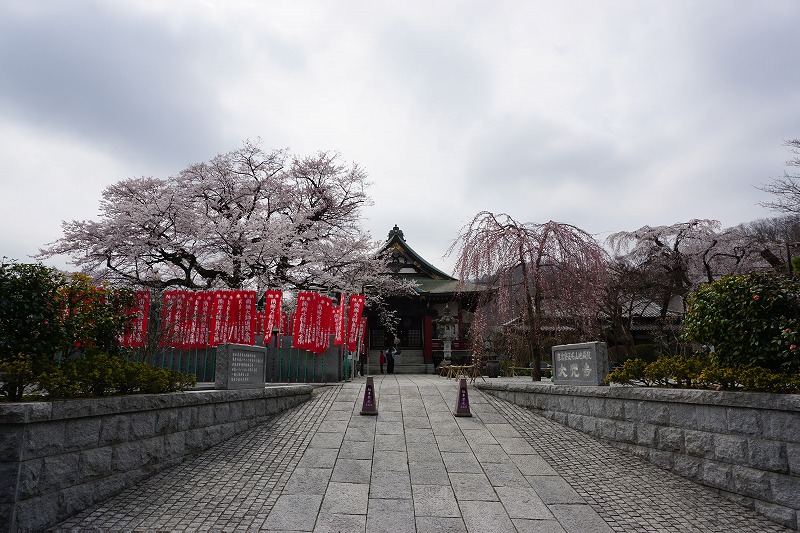 境内に花を咲かせている桜は、紅しだれ桜と申しまして樹齢約二百年ともいわれ、高さ十五メートル、幹回りは四メートル、枝の周囲は四十 メートルにもなり満開の姿は笠をかぶったお姫様に似ている事から桜姫とも呼ばれております。開花の時期は毎年お被岸過ぎの三月下旬 から四月の初頭までの十日間程、精一杯艶やかな姿を披露してくます。