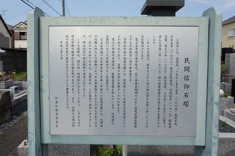 この石塔群は、時代的・地域的にまとまっており、いずれも江戶時代中期の標準的な作風を残すものであり、また、当時の久我山地域の信仰形態や風俗を示すものとして貴重なものです。