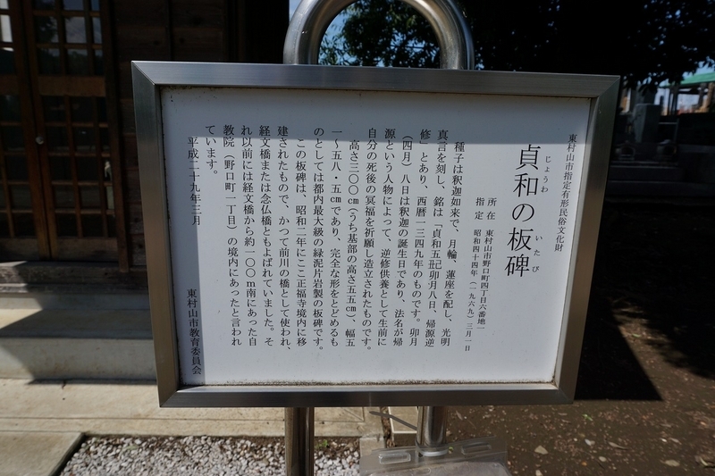 この板碑は、昭和二年にここ正福寺境内に移建されたもので、かつて前川の橋として使われ、経文橋または念仏橋ともよばれていました。それ以前には経文橋から約一〇〇m南にあった自教院(野口町一丁目)の境内にあったと言われています。