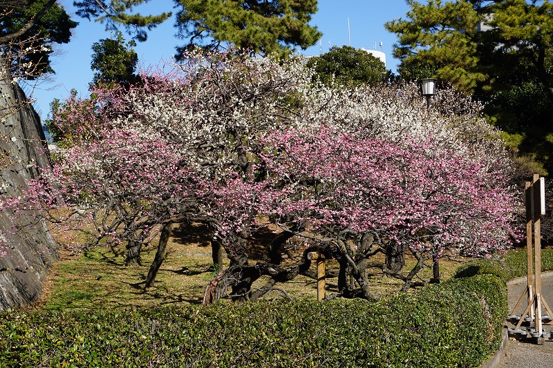 この地に最初に城を築いた太田道灌が、 このあたりに天神社をまつり、 数百株の梅を植えたことから「梅林坂」 の名が付いたといわれています。 現在は約70本の紅白の梅が植えられており、12月末から2月まで花が楽しめます。